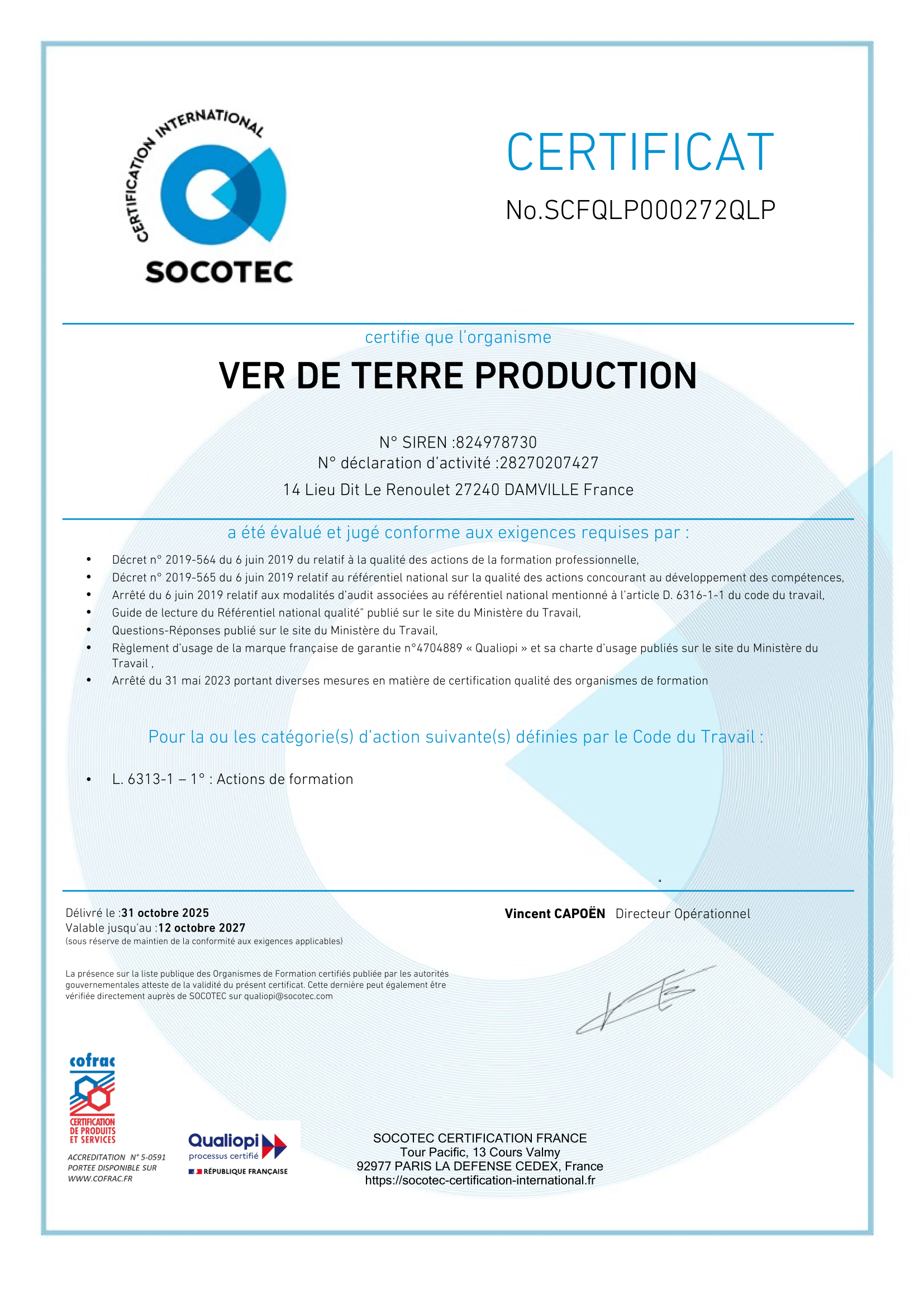 Grâce au respect d'un référentiel national unique, la marque « Qualiopi » vise à attester de la qualité du processus mis en œuvre par les prestataires d’actions concourant au développement des compétences. Ver de Terre Production est certifié qualité depuis le mois d'octobre 2020.